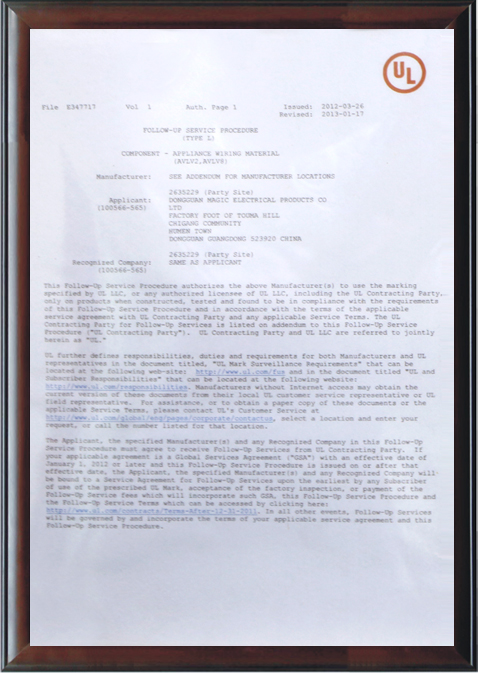 品牌實力保證公司通過并擁有電線之UL安規(guī)認證,電線加工之UL認證,質量管理體系之ISO9001認證。